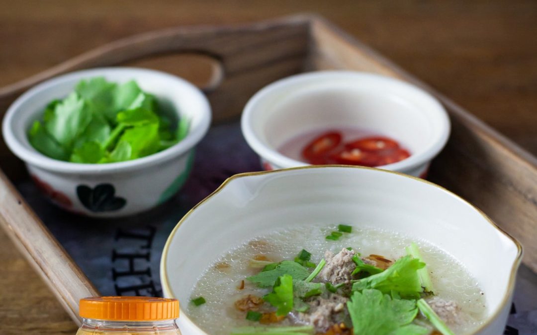 3. ใส่ตังฉ่าย ปรุงรสด้วยซอสปรุงรส และน้ำกระเทียมดอง (น้ำซุปจะออกรสหวานกลมกล่อมจากทั้งข้าวและน้ำกระเทียมดอง) ปิดไฟ ใส่คึ่นช่าย หัวหอม กระเทียมเจียว พริกไทย